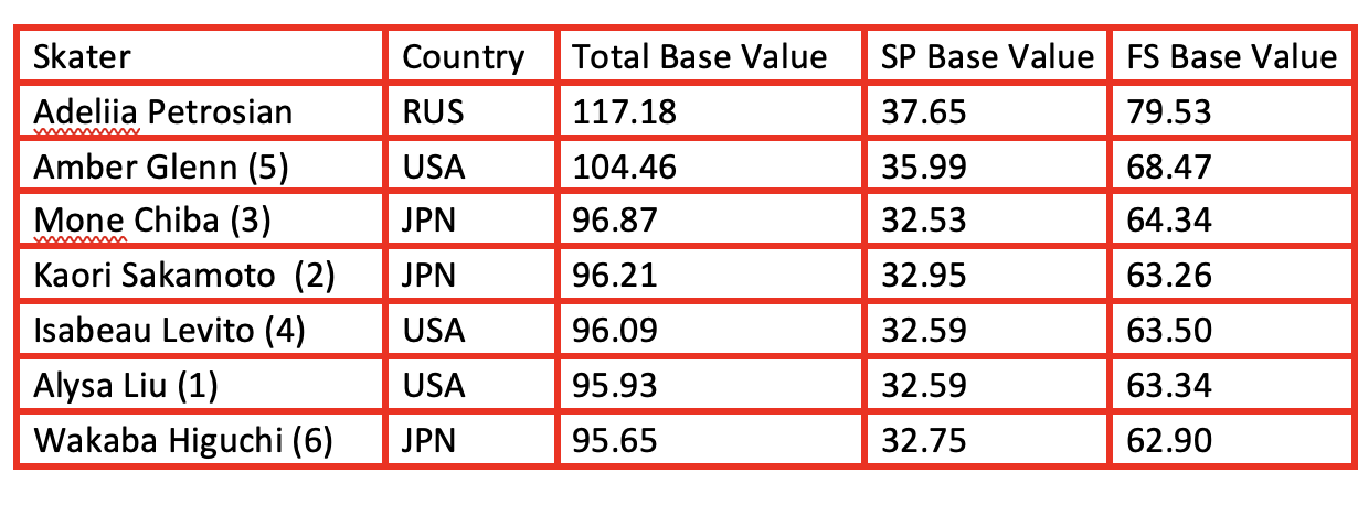 For the chart below, aided by the wealth of sortable numerical information on skatingscores.com, I listed Petrosian’s top base values for each segment during 2024-25 with those of the top six finishers (placements in parentheses) at the 2025 World Championships.