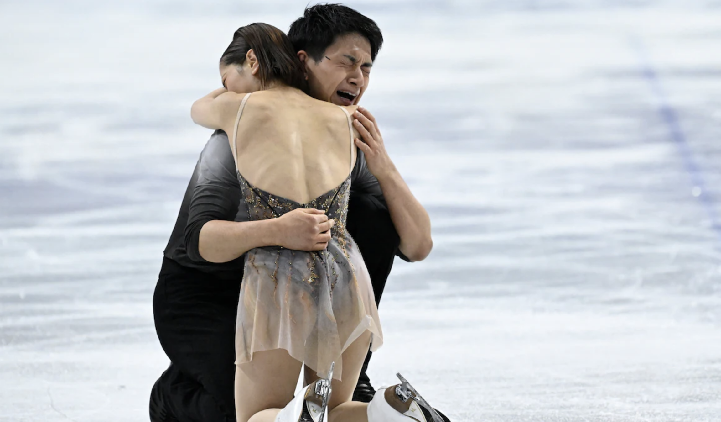 /The emotional reaction of Riku Miura and Ryuichi Kihara after their free skate.